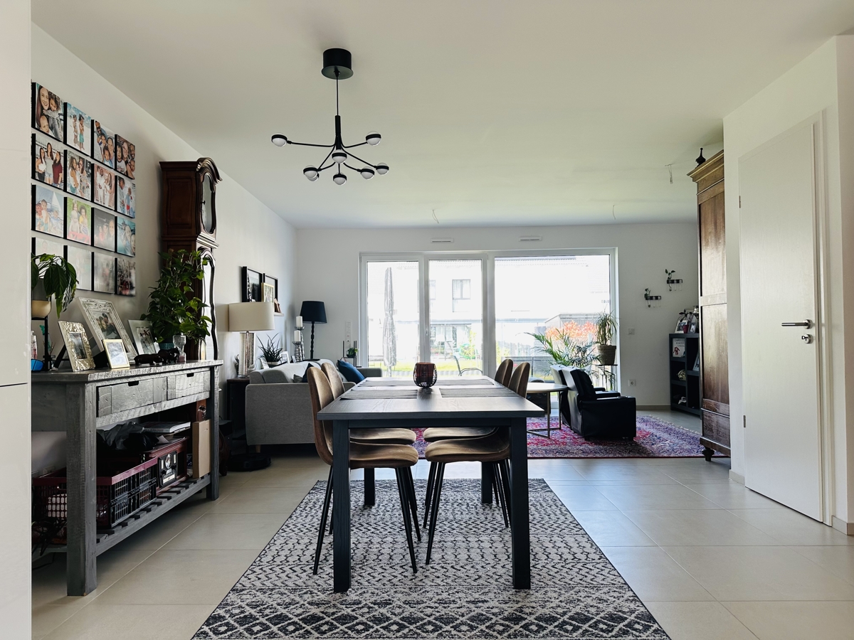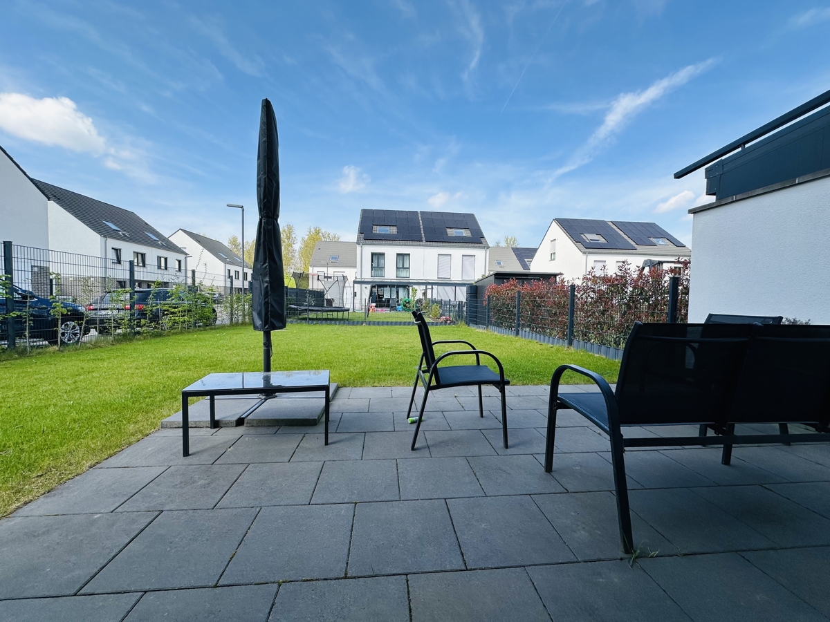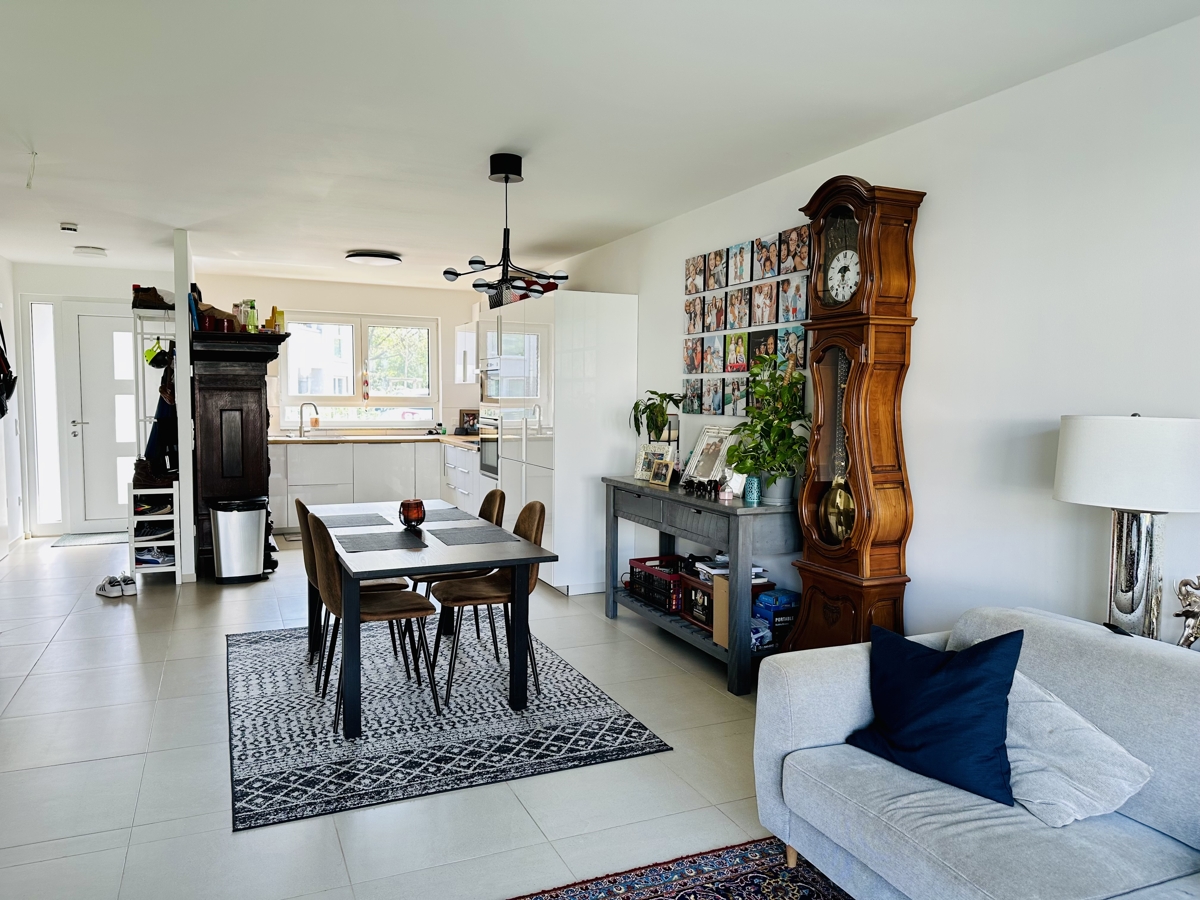 Das Wohn- Esszimmer hat bodentiefe Fenster zur rückwärtigen überdachten Terrasse mit Zugang zum liebevoll angelegten großen Garten.