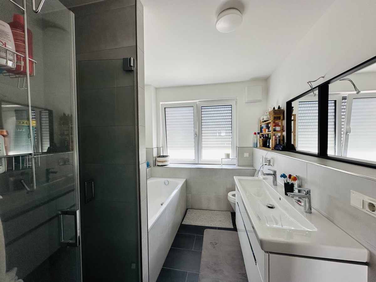 Eine weitere Wohnung (ca. 93 m²) befindet sich im 1. Obergeschoß und verfügt ebenfalls über eine großzüge Raumaufteilung. Diese Einheit besteht aus 3 Zimmern, Küche, Diele, Bad und einer großen Dachterrasse mit Blick ins Grüne. Diese Wohnung ist vermietet.