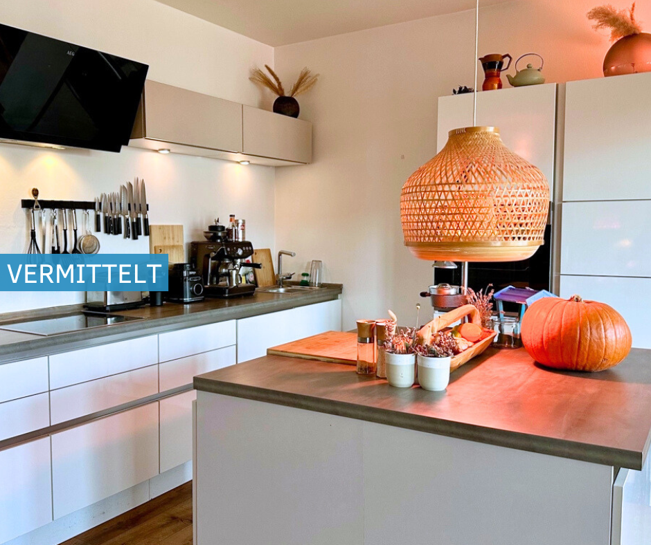 Der großzügige Wohn-Essbereich mit der offenen Küche bildet das Zentrum der Wohnung. Er eröffnet sich zum Süd-West ausgerichteten Garten und die bodentiefen Terrassentüren bringen viel Licht und Sonne in den Raum.