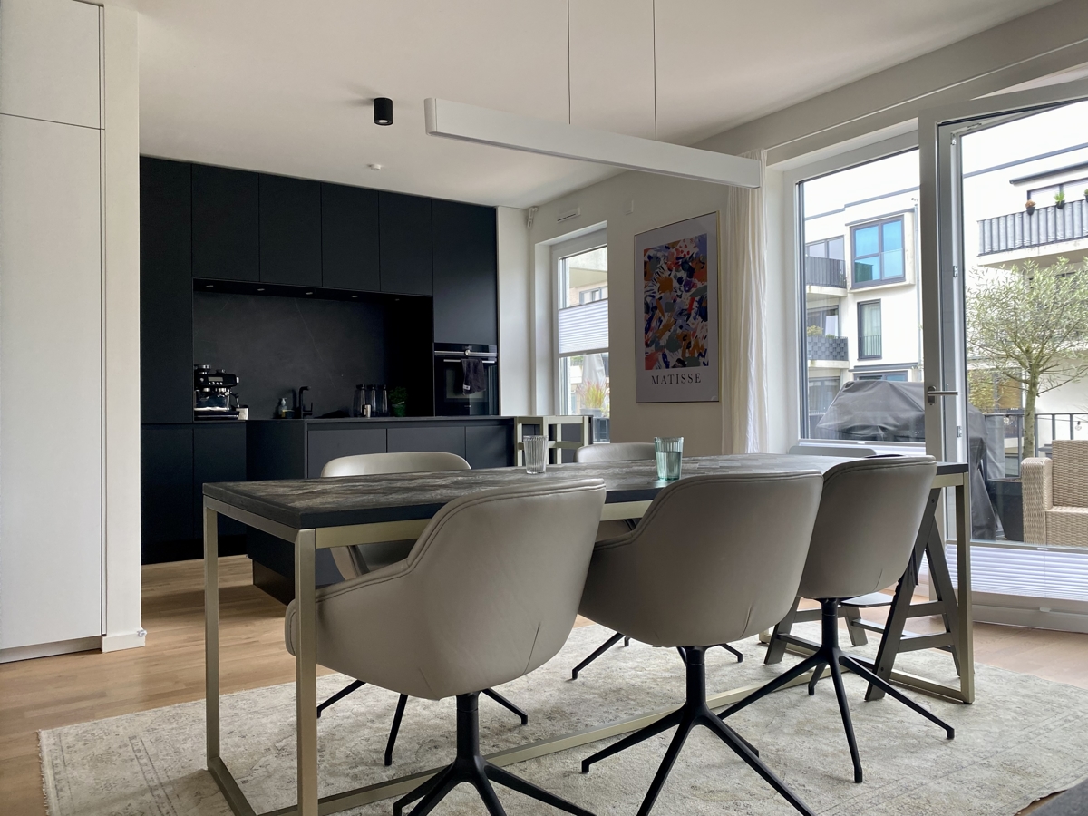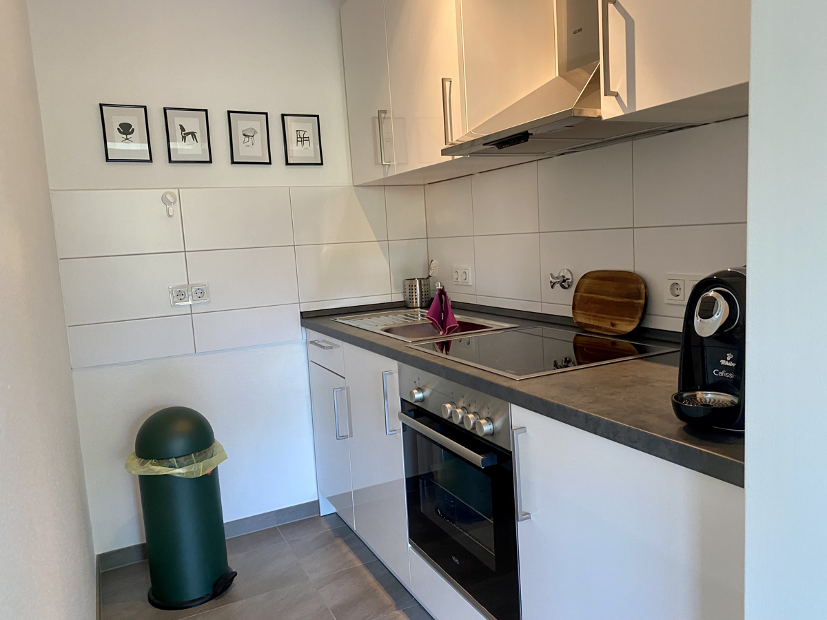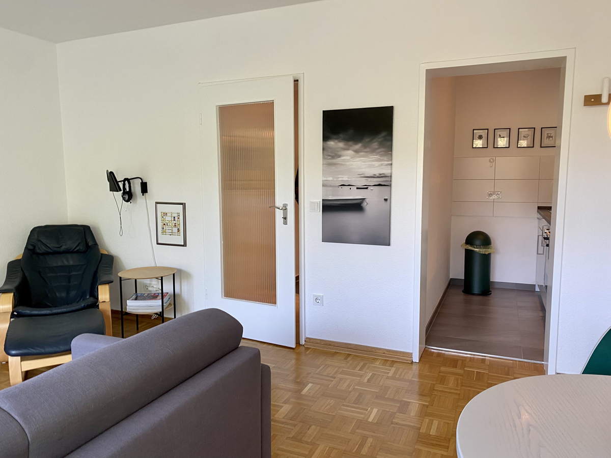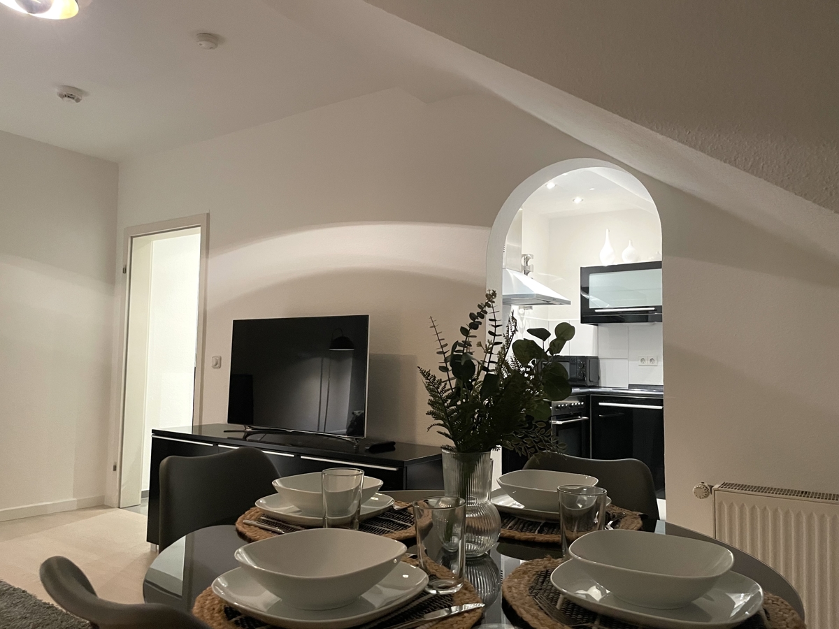 Das geschmackvoll eingerichtete Wohnzimmer überzeugt mit einem großen Fenster, das viel Tageslicht einlässt, und einer angrenzenden, offen gestalteten Küche. Die Küche ist nicht nur funktional, sondern bietet ausreichend Platz für kulinarische Entfaltung – perfekt auch für gesellige Abende mit Gästen. Die stilvolle Möblierung der gesamten Wohnung umfasst alles, was Sie für einen komfortablen Start benötigen, von gemütlichen Sitzmöbeln bis hin zu praktischen Haushaltsgegenständen.