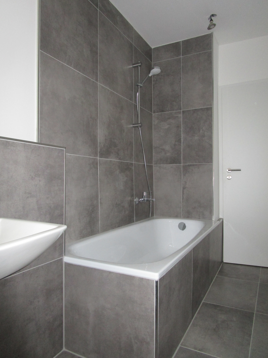 Das Badezimmer ist grau gefliest und wurde mit einer Badewanne ausgestattet.